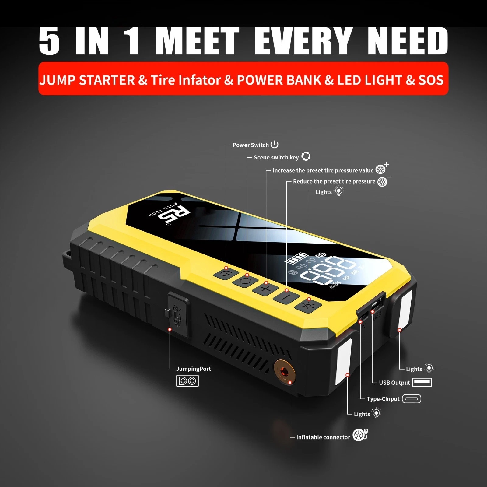 8000mAh Jump Starter and Power Bank – 800A Peak, 4-in-1 with Air Compressor, Battery Booster. Yellow