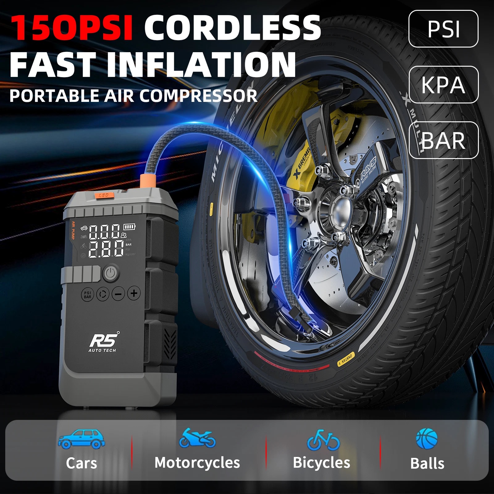 The R5 Auto Tech 8000mAh Ultra-safe Jump Starter Power Pack is a versatile 4-in-1 emergency tool designed to keep you prepared on the road. With an impressive 800A peak current, it delivers reliable jump-starts for petrol engines up to 4.0L and diesel engines up to 2.8L, getting you back on the road swiftly. The built-in 150PSI air compressor makes tyre inflation effortless, whether you're dealing with a slow puncture or a flat tyre at the roadside. As a portable power bank, it also keeps your electronic devices charged during emergencies, ensuring you're never left without communication. The integrated LED torch features multiple modes, including an emergency flashing setting, providing essential illumination when you need it most. Compact and lightweight, this device is easy to store in your boot or glove-box, making it an indispensable companion for any journey. A truly comprehensive roadside emergency solution in one convenient package.