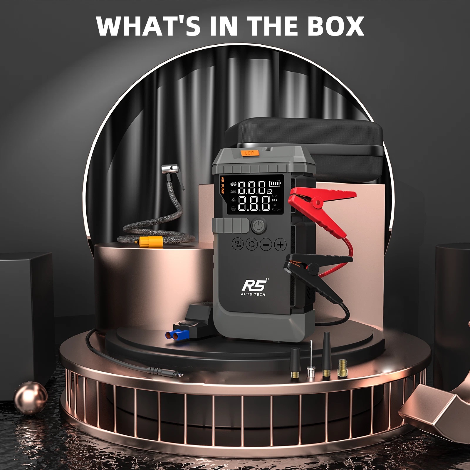 The R5 Auto Tech 8000mAh Ultra-safe Jump Starter Power Pack is a versatile 4-in-1 emergency tool designed to keep you prepared on the road. With an impressive 800A peak current, it delivers reliable jump-starts for petrol engines up to 4.0L and diesel engines up to 2.8L, getting you back on the road swiftly. The built-in 150PSI air compressor makes tyre inflation effortless, whether you're dealing with a slow puncture or a flat tyre at the roadside. As a portable power bank, it also keeps your electronic devices charged during emergencies, ensuring you're never left without communication. The integrated LED torch features multiple modes, including an emergency flashing setting, providing essential illumination when you need it most. Compact and lightweight, this device is easy to store in your boot or glove-box, making it an indispensable companion for any journey. A truly comprehensive roadside emergency solution in one convenient package.